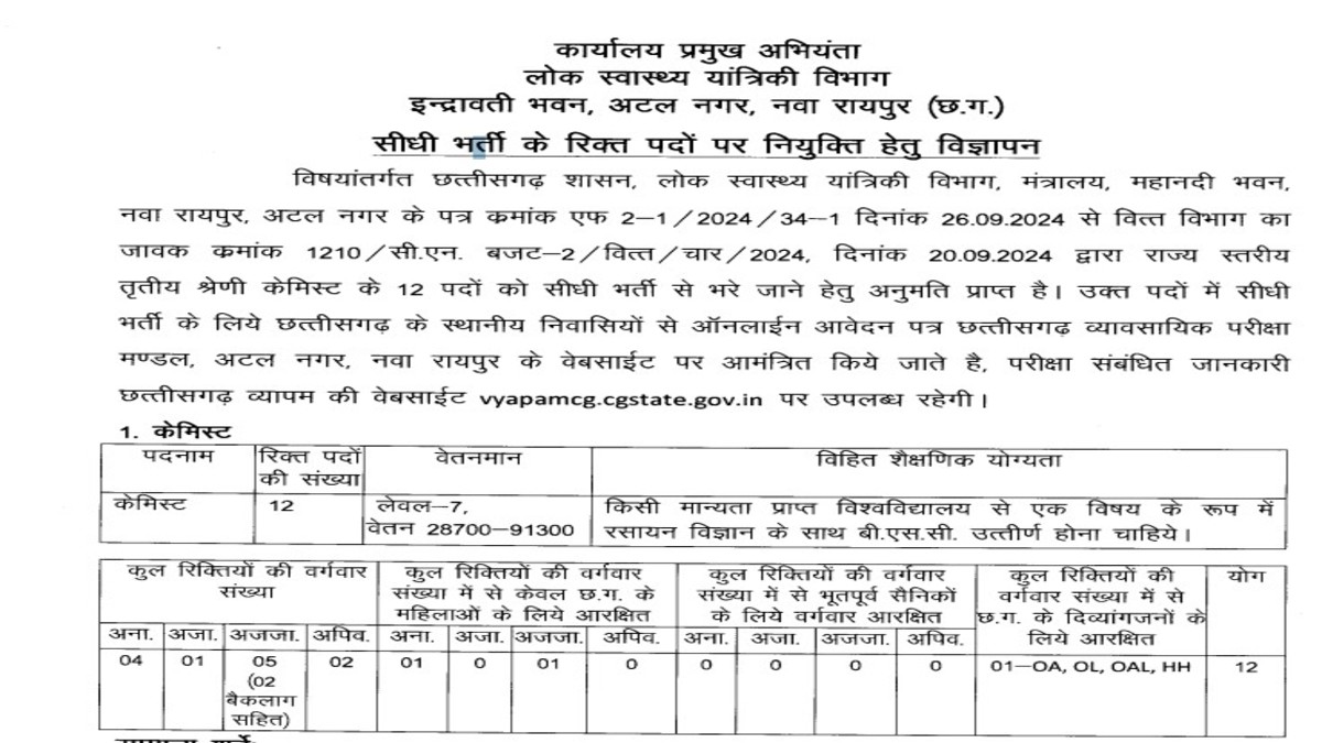 Cg Vyapam छत्तीसगढ़ में केमिस्ट पदों पर भर्ती के लिए आवेदन शुरू, एनवायरमेंट बोर्ड ने जारी किया नोटिफिकेशन