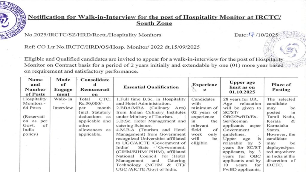 Railway IRCTC Vacancy 2025: रेलवे में बिना परीक्षा नौकरी पाने का मौका, 30000 मंथली सैलरी के साथ मिलेंगी ये सुविधाएं … Continue reading Railway IRCTC Vacancy 2025 : रेलवे में बिना परीक्षा नौकरी पाने का मौका, 30000 मंथली सैलरी के साथ मिलेंगी ये सुविधाएं