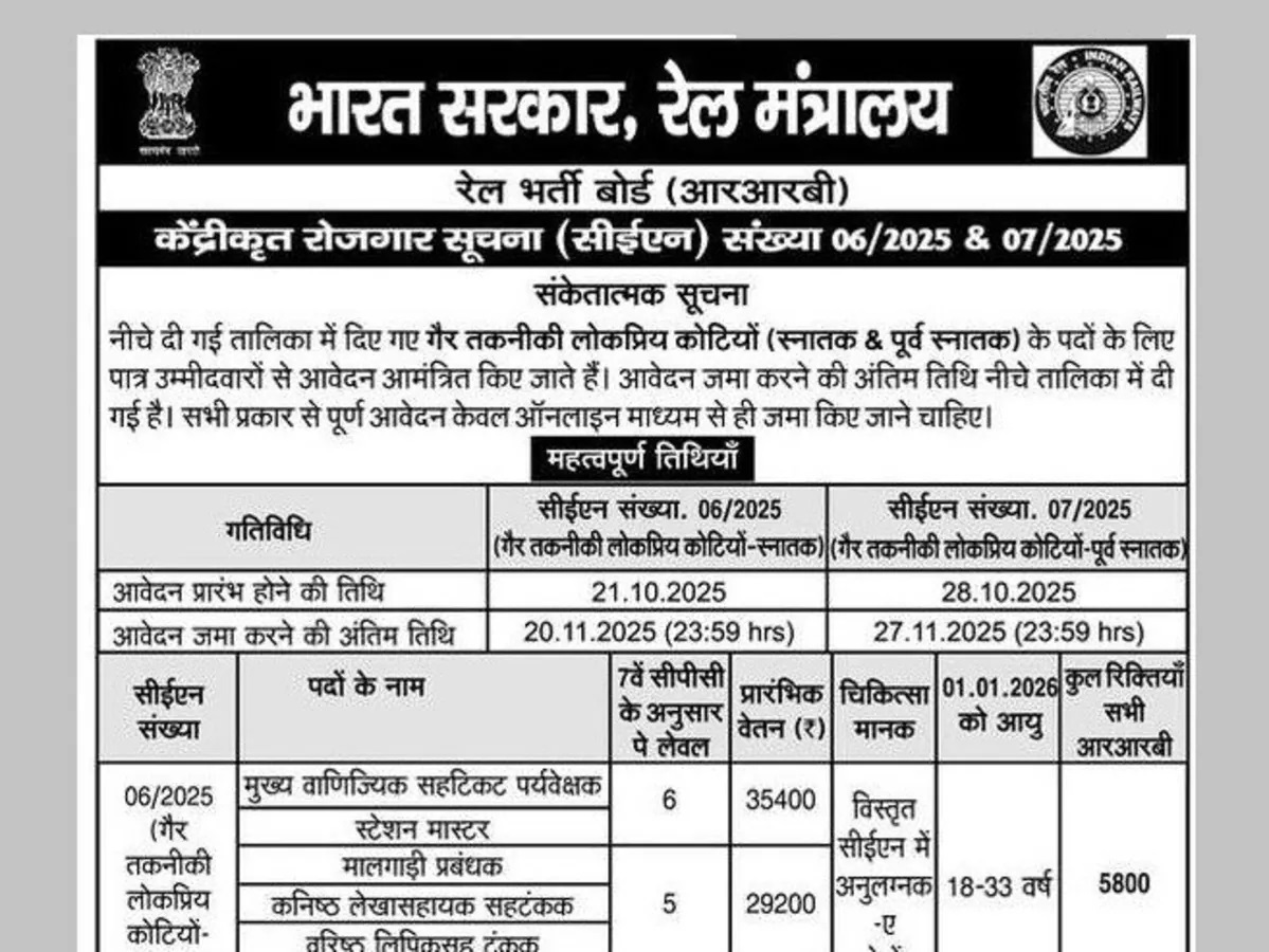 Railway Bharti 2025 Apply Last Date : रेलवे में नौकरी का मौका, NTPC और जूनियर इंजीनियर के 5620 पदों पर आवेदन अगले हफ्ते से